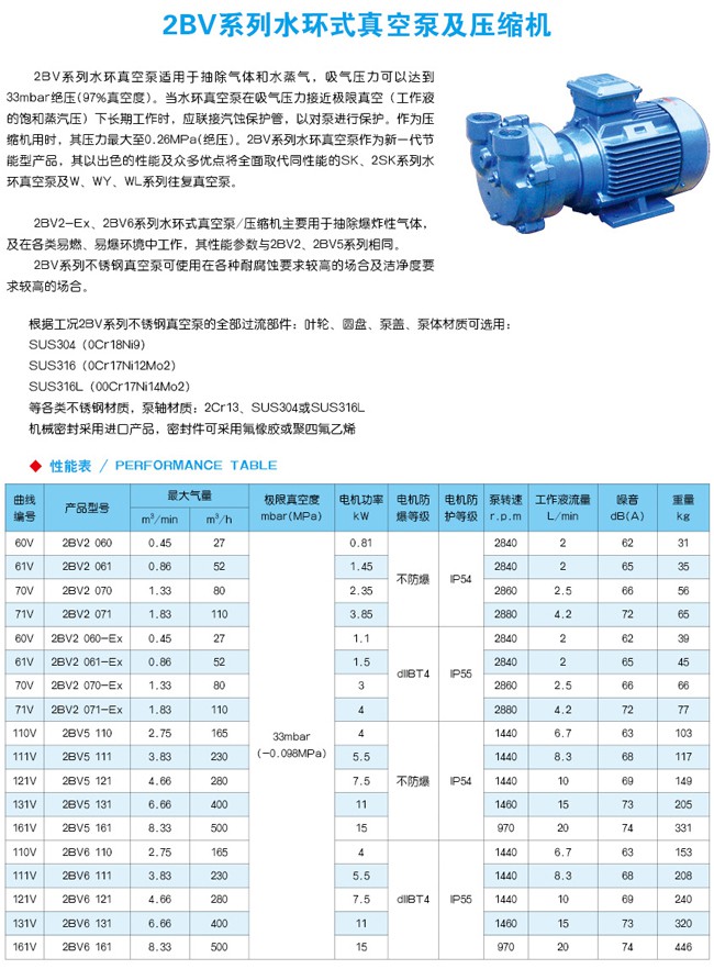 2BV水环真空泵适用于抽除气体和水蒸气,吸气压力可以达到33mbar绝压(97%真空度)。当真空泵在吸气压力低于80mbar的状态下长期工作时,应联接气蚀保护管,以对泵进行保护。如配大气喷射器,吸气压力可达10mbar,喷射器可直接安装在真空泵上。作为压缩机用时,其压力至0.26MPa(绝压) 。